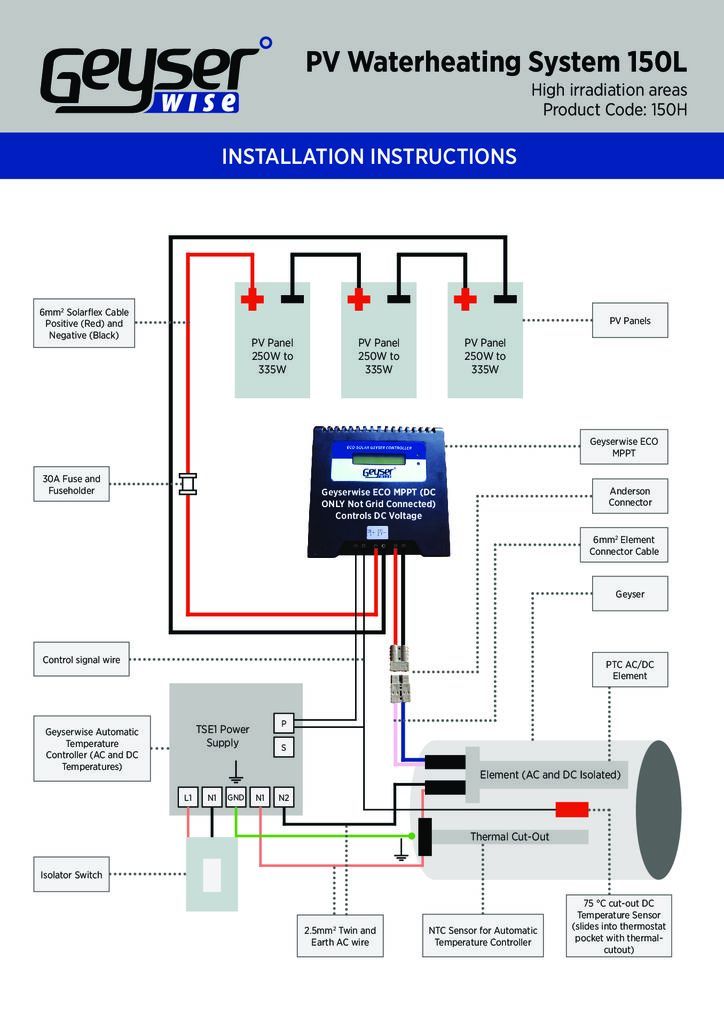 GEYSERWISE Solar PV Water Heating Kit for 150L Geyser is a system that allows you to convert your existing electrical geyser to a solar-powered geyser regardless of where it is situated, providing huge savings when it comes to electrical consumption. Get your water heating system off-grid with no plumbing and no maintenance.
